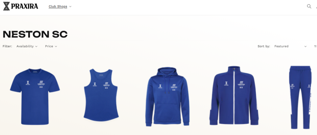 Our club kit is supplied by Schoolwear Outlet in Neston under their own sports brand Praxira. Each member will be suplied with teeshirt when they join the club (until funds allow it!). Swimmers can but other kit directly through the shop – nothing is compulsory.